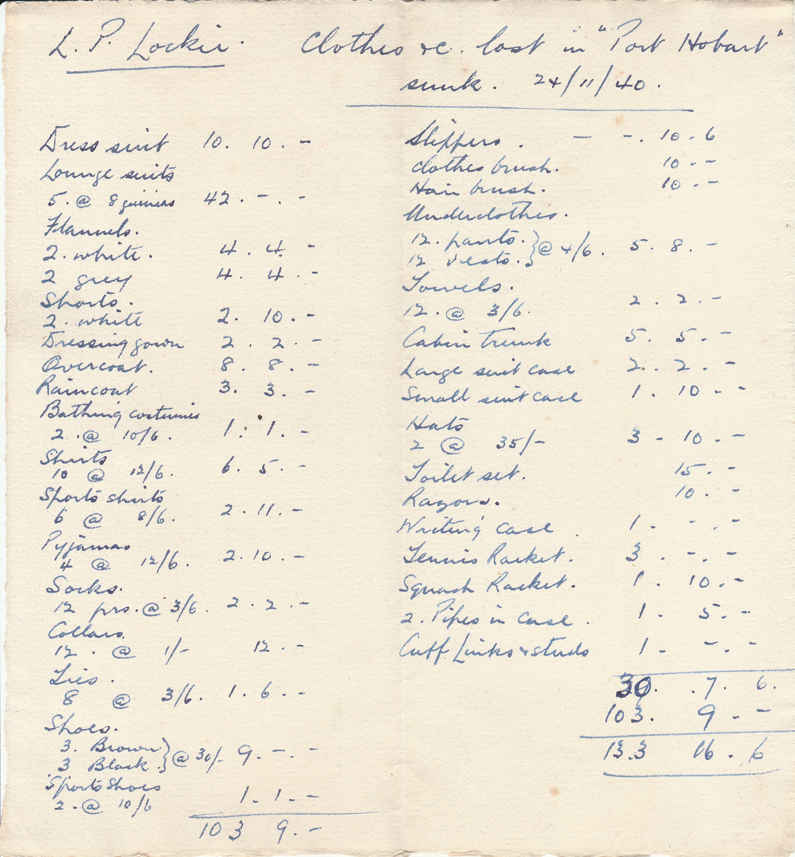 Inventory of Leslie's clothing and personal items, lost in the sinking of the MV Port Hobart