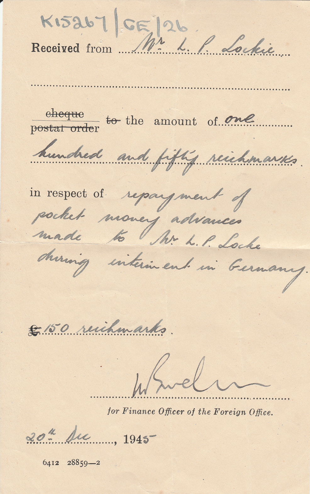 Receipt for repayment of camp 'pocket money' advances from the Foreign Office