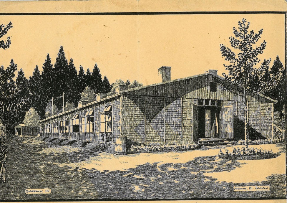 The following is an A4 sized pen and ink drawing of Barrack 15, stored along with the Wartime Logbook.